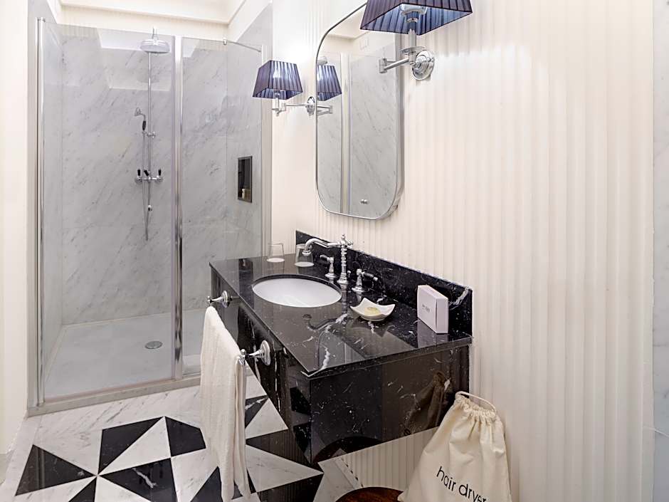 Please note that this unit is located in the annex, which is not serviced by a elevator. The rooms have a size of 65 square yards, are located on the second and top floors of the annexed villa, overlook the hotel's urban garden, have a double bed, and have two bathrooms in refined marble, one with a bathtub and the other with a shower.